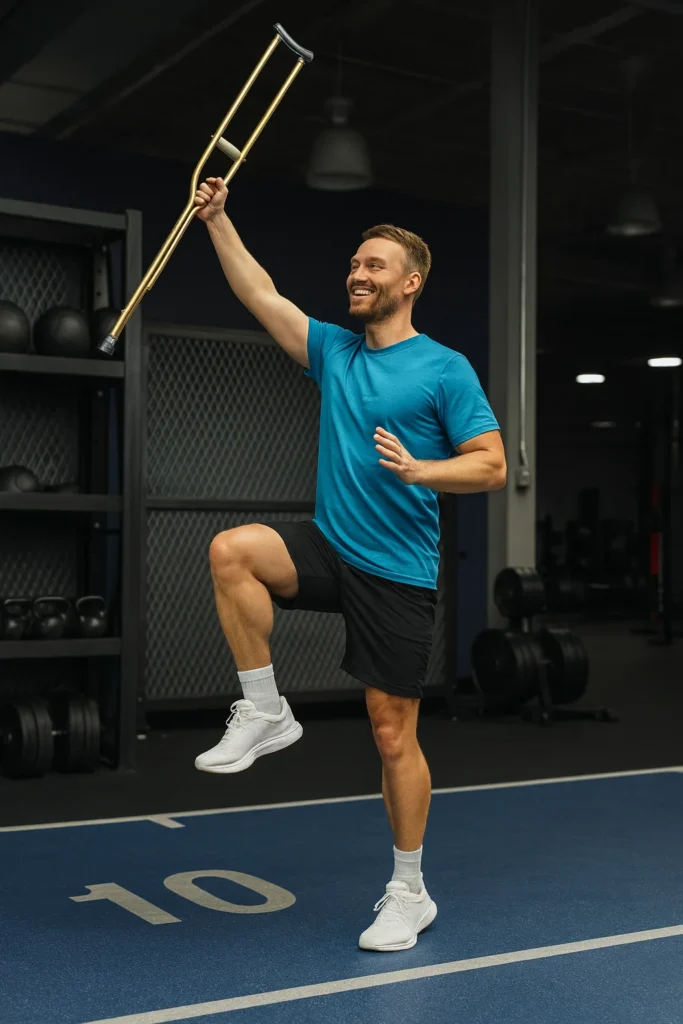 - 2–6 hét: mozgástartomány növelése, alap erősítés (quadriceps–hamstring–csípő), járáskép rendezése, egyensúly alapok.